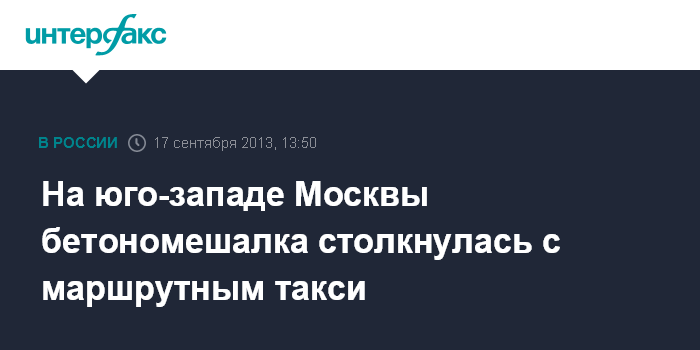 Москва. 17 сентября. INTERFAX.RU - Шесть человек, по предварительным данным, пострадали в результате столкновения маршрутного такси и бетономешалки на юго-западе Москвы.
