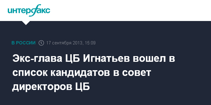 Москва. 17 сентября. INTERFAX.RU - Бывший председатель Банка России Сергей Игнатьев вошел в список кандидатов в совет директоров ЦБ РФ.