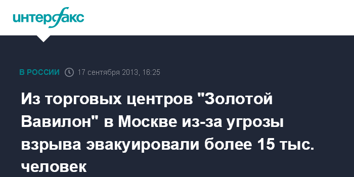 Москва. 17 сентября. INTERFAX.RU - Более 15 тысяч человек были эвакуированы из трех расположенных в столице ТЦ "Золотой Вавилон" после звонка анонима с сообщением о бомбе, сообщили "Интерфаксу" в пресс-службе московского главка МВД во вторник.