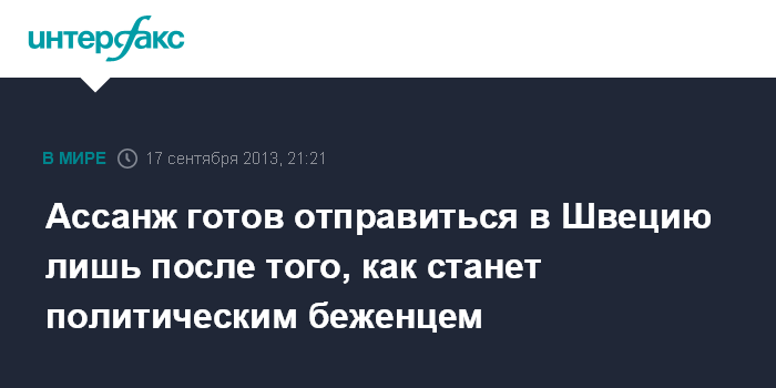 Лондон. 17 сентября. INTERFAX.RU - Основатель веб-сайта Wikileaks Джулиан Ассанж может отправиться в Швецию только при условии получения документа политического беженца, сообщает во вторник агентство EFE. "Для меня не составило бы каких-либо проблем отправиться в Швецию, чтобы свидетельствовать (в суде - ИФ), если бы мне предоставили паспорт в соответствии с моим положением политического беженца", - сказал он во время видеоконференции из посольства Эквадора в Лондоне.