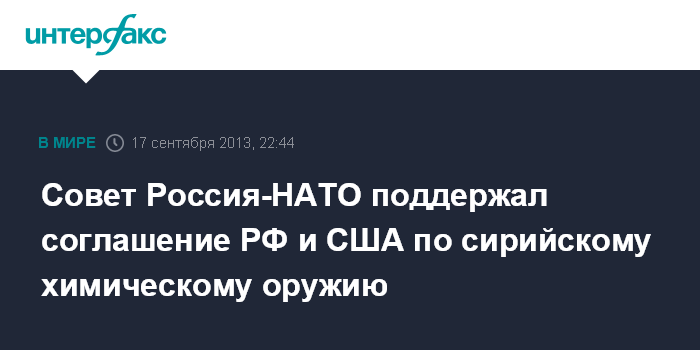 Брюссель. 17 сентября. INTERFAX.RU - Совет Россия-НАТО приветствует достижение российско-американского соглашения по уничтожению сирийского химического оружия, говорится в коммюнике, опубликованном во вторник по окончании чрезвычайной встречи, посвященной ситуации в Сирии.