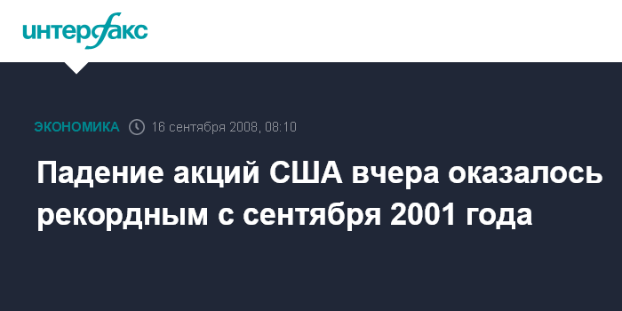 Москва. 16 сентября. INTERFAX.RU - Американские акции пережили в понедельник рекордное с сентября 2001 года снижение цен на фоне кризиса вокруг Lehman Brothers и других финансовых структур Уолл-стрит.