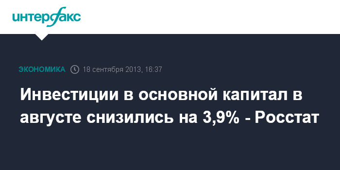 18 сентября. FINMARKET.RU - Инвестиции в основной капитал в России в августе 2013 года снизились на 3,9% по сравнению с августом 2012 года и составили 1 трлн 137 млрд руб., говорится в сообщении Федеральной службы госстатистики (Росстата). По сравнению с предыдущим месяцем инвестиции выросли на 6,8%.