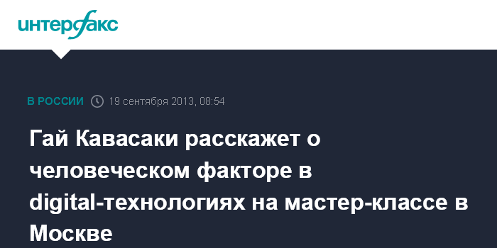 Москва. 19 сентября. INTERFAX.RU - 3 октября в Москве, в центре Digital October состоится мастер-класс "Разработка digital стратегии. Новейшие инструменты и технологии", с участием одним из первых сотрудников Apple Гая Кавасаки и его партнера Скотт Клососки.