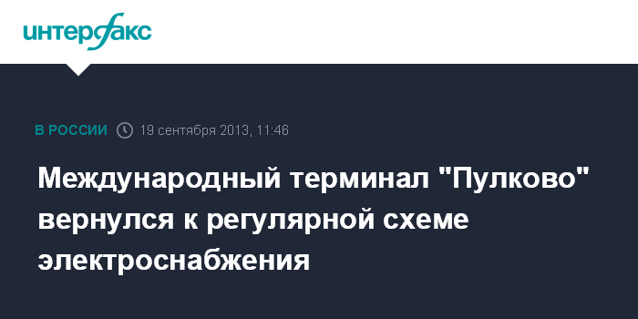 Санкт-Петербург. 19 сентября. INTERFAX.RU - Электроснабжение международного терминала аэропорта "Пулково" в Санкт-Петербурге, где накануне возникли неполадки на внешних сетях, переводится на обычную схему.