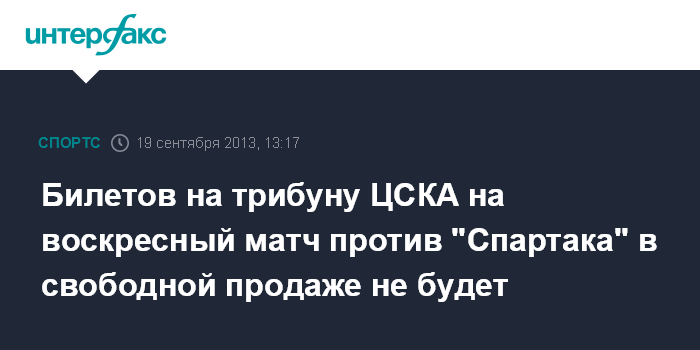 Москва. 19 сентября. INTERFAX.RU - ЦСКА распространит полагающиеся армейцам билеты на дерби со "Спартаком" среди своих организованных фанатских организаций. В свободной продаже билетов не будет, сообщает сайт "красно-синих".