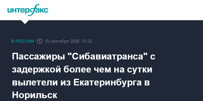 Москва. 16 сентября. INTERFAX.RU - Пассажиры рейса N412 авиакомпании "Сибавиатранс" более суток провели в аэропорту "Кольцово" (Екатеринбург) прежде чем вылететь в Норильск.
