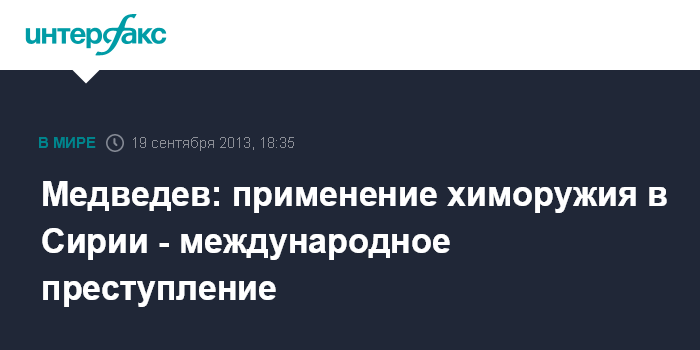Москва.19 сентября. INTERFAX.RU - Премьер-министр России Дмитрий Медведев назвал применение химического оружия в Сирии международным преступление, расследование которого должно быть проведено в рамках международных правил.
