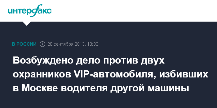 Москва. 20 сентября. INTERFAX.RU - Уголовное дело возбуждено в отношении двух сотрудников охраны, сопровождавших VIP-автомобиль с "престижными" номерами, избивших водителя в центре Москвы.