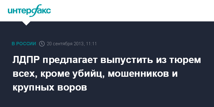Москва. 20 сентября. INTERFAX.RU - ЛДПР готова поддержать любую амнистию и предлагает оставить за решеткой только убийц, мошенников и крупных воров, заявил лидер партии и глава ее думской фракции Владимир Жириновский.