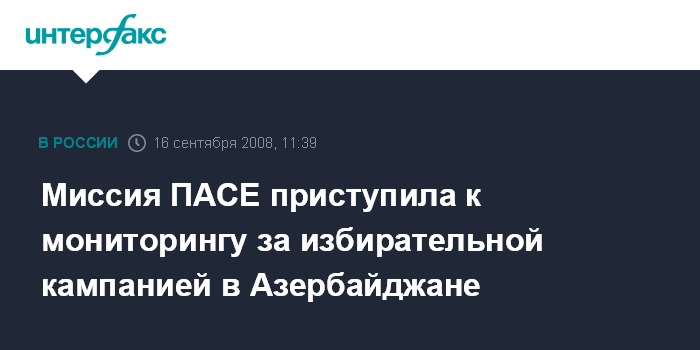 Москва. 16 сентября. INTERFAX.RU - Наблюдательная миссия Парламентской Ассамблеи Совета Европы (ПАСЕ) за президентскими выборами в Азербайджане приступила в Баку к исполнению своих непосредственных обязанностей, сообщили агентству "Интерфакс-Азербайджан" в парламенте республики.