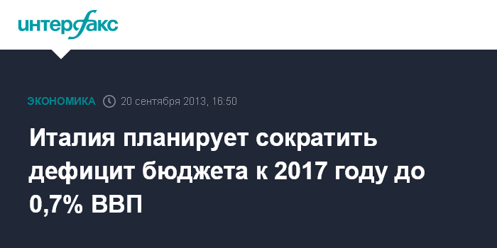 20 сентября. FINMARKET.RU - Дефицит бюджета Италии по итогам 2013 года составит 3,1% ВВП, свидетельствуют обновленные прогнозы итальянского министерства экономики. По прогнозам ведомства, в 2014 году бюджетный дефицит сократится до 2,3%, а к 2017 году - до 0,7% ВВП.