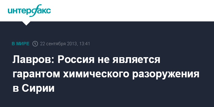 "Я хочу уточнить, что мы не являемся гарантом химического разоружения в Сирии. Мы обеспечили присоединение Сирии к Конвенции о запрещении химического оружия без всяких оговорок - в отличие от американцев, которые присоединились к Конвенции с оговорками", - сказал министр в интервью программе "Воскресное время" Первого канала в эфире на Дальний Восток.