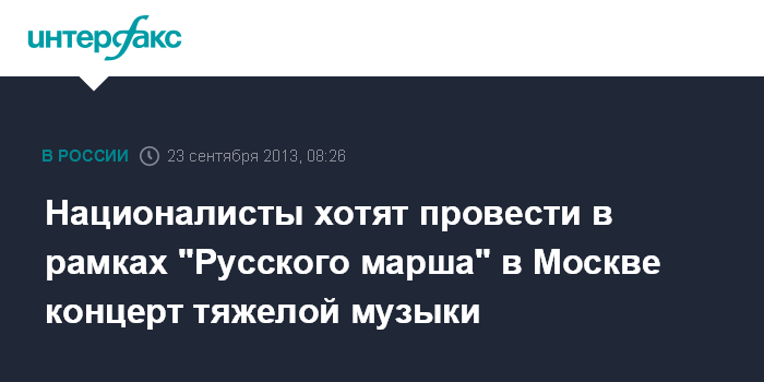 "Первая заявка на "Русский марш-2013" подана. Мы готовим большой, профессиональный концерт с тяжелой музыкой не только для националистов, но и для москвичей. Уже есть ряд договоренностей с широко известными группами, но мы их пока не называем", - заявил "Интерфаксу" Д.Демушкин.