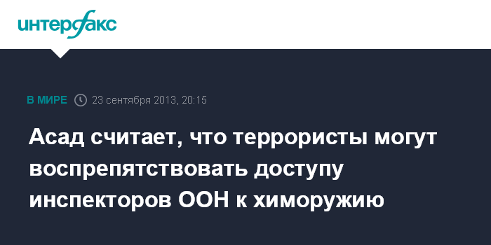 "Мы знаем, что террористы подчиняются приказам других стран, чьи правительства могут подтолкнуть их к тому, чтобы они воспрепятствовали работе инспекторов и возложили вину (в применении химоружия - ИФ) на сирийское правительство", - заявил в интервью центральному телевидению Китая сирийский лидер Башар Асад.