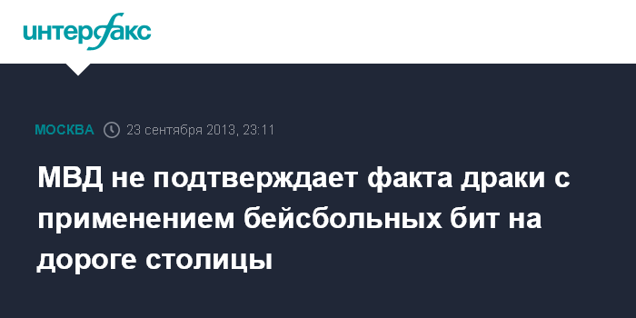 Москва. 23 сентября. INTERFAX.RU - ГУ МВД России по Москве не подтверждает факт драки бейсбольными битами на Беговой улице, однако продолжает проверку из-за поступившего сообщения.