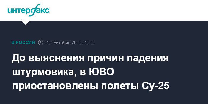 Москва. 23 сентября. INTERFAX.RU - Полеты самолетов типа Су-25 в Южном военном округе (ЮВО) приостановлены до выяснения всех причин и обстоятельств авиационного происшествия, произошедшего на Кубани, сообщили "Интерфаксу" в управлении пресс-службы и информации Минобороны РФ в понедельник.