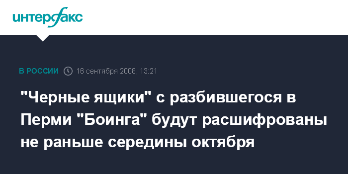 Москва 16 сентября. INTERFAX.RU - На расшифровку бортовых самописцев ("черных ящиков") разбившегося в Перми самолета Боинг-737 потребуется не менее месяца, сообщили "Интерфаксу" в Следственном комитете при прокуратуре (СКП) РФ.