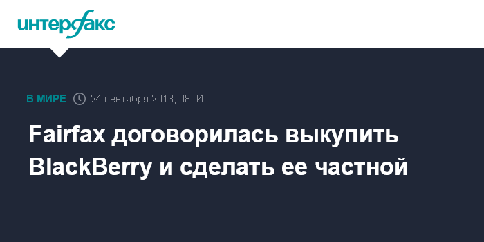 Ватерлоо. 24 сентября. INTERFAX.RU - Канадская BlackBerry, производитель одноименных смартфонов, будет выкуплена за $4,7 млрд инвестиционным консорциум во главе с Fairfax Financial Holdings Ltd., если не найдется более щедрых покупателей, сообщает агентство Bloomberg.