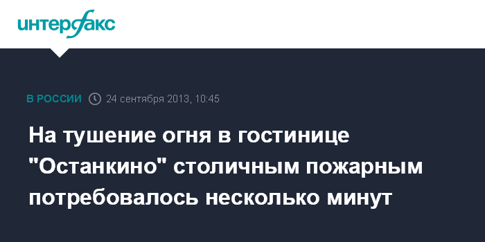 Москва. 24 сентября. INTERFAX.RU - В МЧС России подтвердили факт пожара в московской гостинице "Останкино" и отметили, что на тушение огня ушло несколько минут.