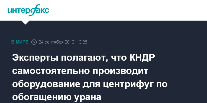 Вашингтон. 24 сентября. INTERFAX.RU - Ученые Северной Кореи способны собственными силами создавать основные компоненты центрифуг для обогащения урана, которые могут быть использованы для создания ядерного оружия, передает во вторник AP со ссылкой на эксперта США по вопросам распространения ядерного оружия Джошуа Поллака.