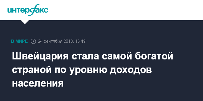 Женева. 24 сентября. INTERFAX.RU - Самой богатой страной в мире по уровню доходов на душу населения остается Швейцария, говорится в ежегодном докладе страховой компании Allianz, опубликованном во вторник.