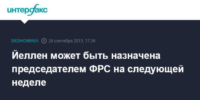 Вашингтон. 24 сентября. INTERFAX.RU - Заместитель председателя Федеральной резервной системы (ФРС) Джанет Йеллен может встать во главе американского ЦБ уже на следующей неделе, сообщает MarketWatch со ссылкой на мнение аналитиков банка Goldman Sachs.
