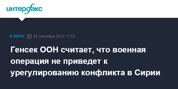 Нью-Йорк (ООН). 24 сентября. INTERFAX.RU - Генсек ООН Пан Ги Мун заявил во вторник на сессии ГА ООН, что кризис в Сирии нельзя разрешить с помощью военного удара.