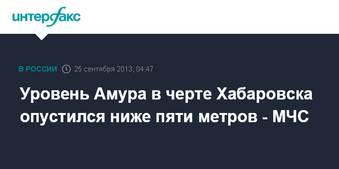 Хабаровск. 25 сентября. ИНТЕРФАКС-ДАЛЬНИЙ ВОСТОК - Уровень Амура в районе Хабаровска за сутки снизился на 16 см и по данным на 08:00 по местному времени (01:00 мск) составляет 492 см, сообщает пресс-служба ГУ МЧС по региону в среду.