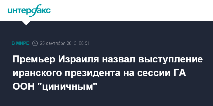 Нью-Йорк (ООН). 25 сентября. ИНТЕРФАКС - Циничным и лицемерным назвал премьер-министр Израиля Биньямин Нетаньяху заявления президента Ирана Хасана Рухани в его выступлении на сессии генассамблеи ООН по вопросам иранской ядерной программы.