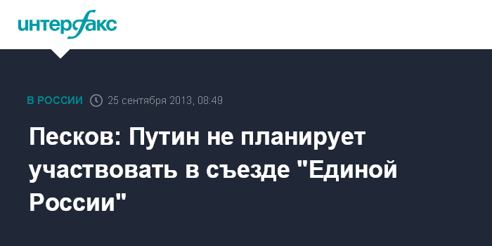 Москва. 25 сентября. INTERFAX.RU - Президент РФ Владимир Путин пока не планирует принимать участия в намеченном на начало октября съезде "Единой России", сообщил пресс-секретарь главы государства Дмитрий Песков.