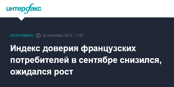 25 сентября. FINMARKET.RU - Индекс доверия предпринимателей к экономике Франции в сентябре 2013 года снизился после четырех месяцев роста на 1 пункт до 97 пунктов с 98 пунктов в августе, свидетельствуют данные национального статистического управления Insee.