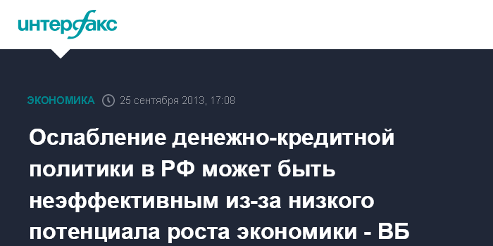 25 сентября. FINMARKET.RU - Ослабление денежно-кредитной политики (ДКП) в России может оказаться неэффективным способом стимулирования экономики с учетом низкого потенциала ее роста. Такое мнение высказал старший экономист Всемирного банка (ВБ) в России Сергей Улатов на пресс-конференции в Москве в среду, посвященной очередному докладу ВБ по экономике РФ.