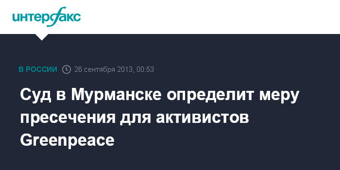 Москва. 26 сентября. ИНТЕРФАКС - Суд в Мурманске в четверг, как ожидается, определит меру пресечения для команды экологов "Гринпис", которые были задержаны за попытку проведения акции протеста против добычи нефти на платформе "Приразломная" в Печорском море.