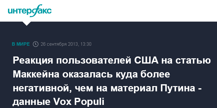 Реакция пользователей США на статью Маккейна оказалась куда более негативной, чем на материал Путина - данные Vox Populi