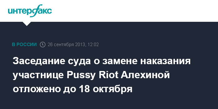 Нижний Новгород. 26 сентября. INTERFAX.RU - Автозаводский районный суд Нижнего Новгорода отложил до 18 октября рассмотрение ходатайства защиты о замене наказания осужденной участнице панк-группы Pussy Riot Марии Алехиной на более мягкое.