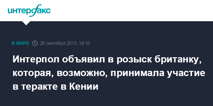 Париж. 26 сентября. INTERFAX.RU - Интерпол по запросу кенийских властей объявил в розыск подданную Великобритании Саманту Льютуэйт, которая, возможно, участвовала в нападении на торговый центр в столице Кении Найроби, говорится в сообщении на сайте организации.