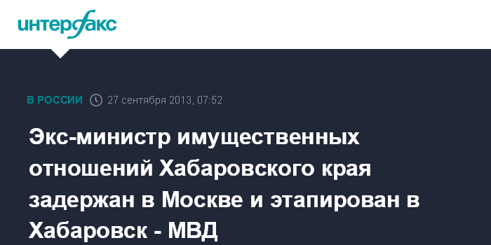 Хабаровск. 27 сентября. ИНТЕРФАКС - ДАЛЬНИЙ ВОСТОК - Сотрудники полиции в Москве задержали и этапировали в Хабаровск экс-министра имущественных отношений правительства региона, сообщает в пятницу УМВД по Хабаровскому краю.