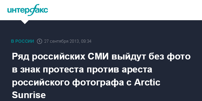 Москва. 27 сентября. INTERFAX.RU - Некоторые российские СМИ 27 сентября откажутся от размещения фотографий в знак солидарности с арестованным в Мурманске российским фотографом Денисом Синяковым, задержанным ранее вместе с активистами Greenpeace на судне Arctic Sunrise.