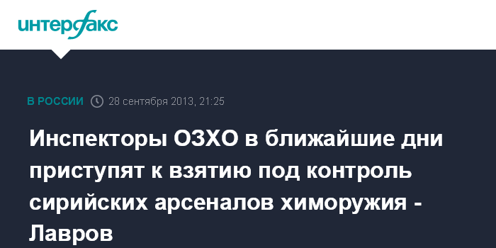 Москва. 28 сентября. ИНТЕРФАКС - В ближайшее время инспекторы Организации по запрещению химического оружия направятся в Сирию, чтобы поставить под контроль места хранения сирийских химических арсеналов, заявил глава МИД РФ Сергей Лавров.