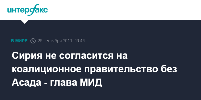 Вашингтон. 29 сентября. ИНТЕРФАКС - Сирия не согласится с формированием коалиционного правительства без участия в нем нынешнего президента страны Башара Асада, заявил сирийский министр иностранных дел Валид Муаллем.