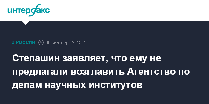 Москва. 30 сентября. INTERFAX.RU - Экс-главе Счетной палаты России Сергею Степашину не предлагали пост руководителя Федерального агентства по делам научных институтов, созданного в рамках реформы Российской академии наук.
