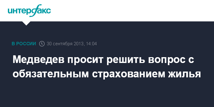 "Я обращаю внимание на то, что мы так и не решили вопрос по обязательному страхованию (жилья. - ИФ). Мне не представляются убедительными бесконечные отговорки, которые на эту тему делали некоторые наши коллеги. Мы каждый раз будем доставать по 50 - 60 млрд рублей при возникновении бедствий, не дай бог, конечно, чтобы еще что-то такое произошло, но у нас страна большая и очень сложная", - сказал Медведев на встрече с вице-премьерами в понедельник.
