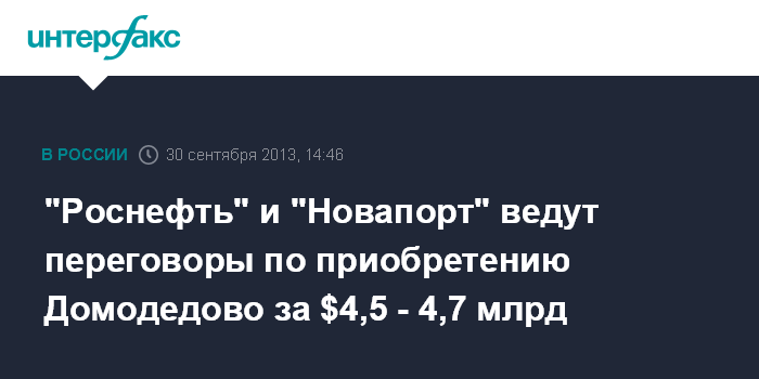 Москва. 30 сентября. INTERFAX.RU - "Роснефть" и "Новапорт" ведут переговоры по приобретению Домодедово за $4,5 - 4,7 млрд, сообщил журналистам в понедельник источник в аэропортовых кругах.