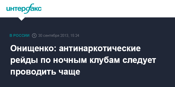 Москва. 30 сентября. INTERFAX.RU - Руководитель Роспотребнадзора, главный государственный санитарный врач РФ Геннадий Онищенко поддержал практику проведения Федеральной службой РФ по наркоконтролю (ФСКН) рейдов в ночных клубах в рамках борьбы с наркоторговлей.