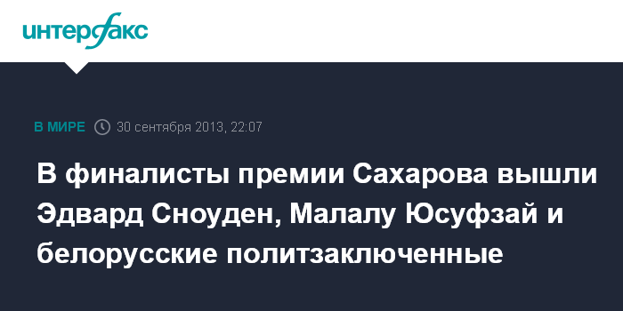 В финалисты премии Сахарова вышли Эдвард Сноуден, Малалу Юсуфзай и белорусские политзаключенные