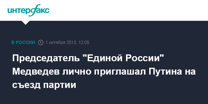 Москва. 1 октября. INTERFAX.RU - У президента РФ Владимира Путина есть приглашение принять участие в работе съезда "Единой России" от председателя партии, премьера Дмитрия Медведева, сообщила "Интерфаксу" пресс-секретарь главы правительства Наталья Тимакова.