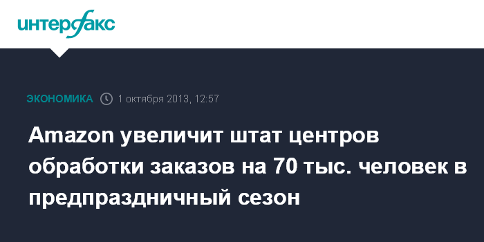 Сиэтл. 1 октября. INTERFAX.RU - Крупнейшая компания интернет-торговли в мире американская Amazon.com Inc. планирует нанять 70 тыс. временных работников на предпраздничный сезон, чтобы справиться с ожидаемым резким ростом заказов, говорится в сообщении компании.