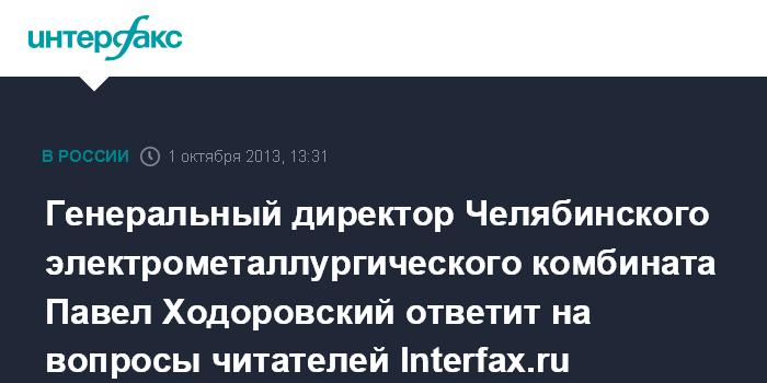 Москва. 1 октября. INTERFAX.RU - В среду, 2 октября, с 11:00 до 13:00 на сайте www.interfax.ru состоится интернет-конференция директора Челябинского электрометаллургического комбината Павла Ходоровского.