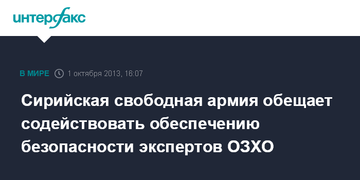 Москва. 1 октября. INTERFAX.RU - Сирийская свободная армия (ССА) готова содействовать обеспечению безопасности экспертов Организации по запрещению химического оружия (ОЗХО), которые будут работать на территории Сирии, заявил представитель Национальной коалиции сирийских оппозиционных и революционных сил (НКСОРС) в Европе Мунзер Махос.